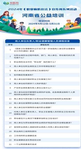 每年的4月25日至5月1日是我国的“《职业病防治法》宣传周”。今年是我国第22个职业病防治宣传周,结合今年宣传周“坚持预防为主,守护职业健康”的主题,河南省职业健康宣传周活动于4月12日开启。华医网为活动提供了职业健康公益培训,培训主要包括职业病防治相关要求、职业健康培训、职业病预防和防护、用人单位职业卫生管理等内容,帮助用人单位和劳动者进一步提高对职业病的认识和重视,提升防护意识和相关知识,促进职业健康,助力健康中原。